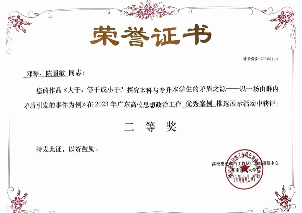 | 邓琴、陈丽敏 | 《大于、等于或小于?探究本科与专升本学生的矛盾之源——以一场由群内矛盾引发的事件为例》 | 二等奖 |