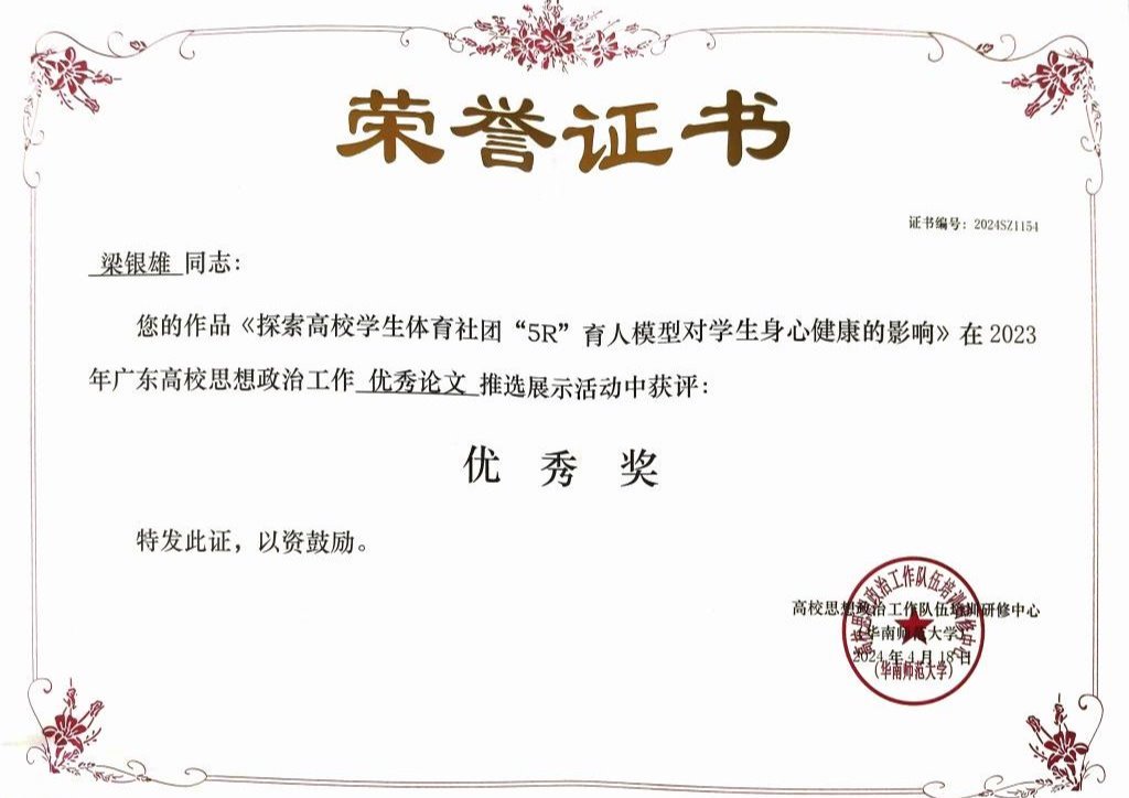 | 梁银雄 | 《探索高校学生体育社团“5R”育人模型对学生身心健康的影响》 | 优秀奖 |