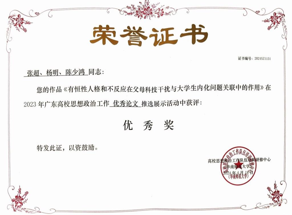 | 张超、杨明、陈少鸿 | 《有恒性人格和不反应在父母科技干扰与大学生内化问题关联中的作用》 | 优秀奖 |