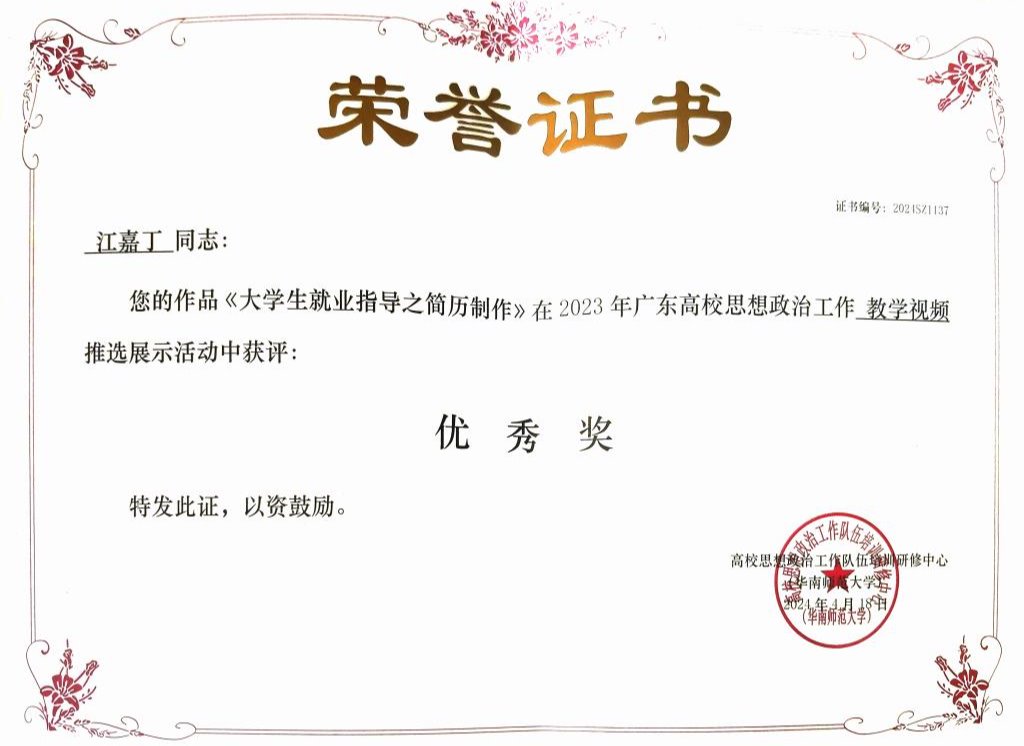 | 江嘉丁 | 《大学生就业指导之简历制作》 | 优秀奖 |