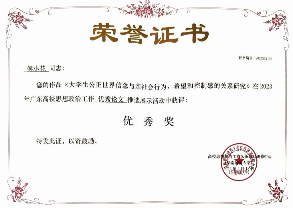 | 9 | 侯小花 | 《大学生公正世界信念与亲社会行为、希望和控制感的关系》 | 优秀奖 |