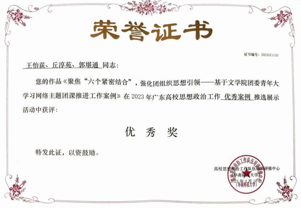 | 王怡荻、丘淳苑、郭堪通 | 《聚焦“六个紧密结合”,强化团组织思想引领——基于文学院团委青年大学习网络主题团课推进工作案例》 | 优秀奖 |