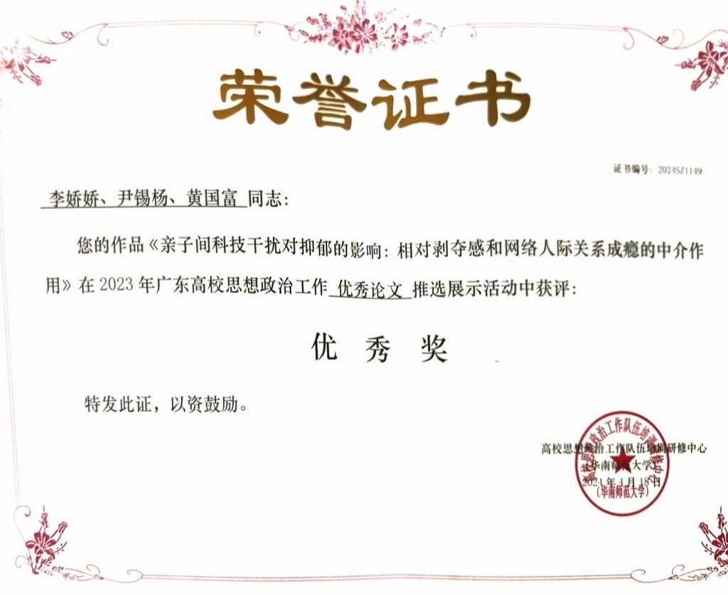 | 李娇娇、尹锡杨、黄国富 | 《亲子间科技干扰对抑郁的影响:相对剥夺感和网络人际关系成瘾的中介作用》 | 优秀奖 |