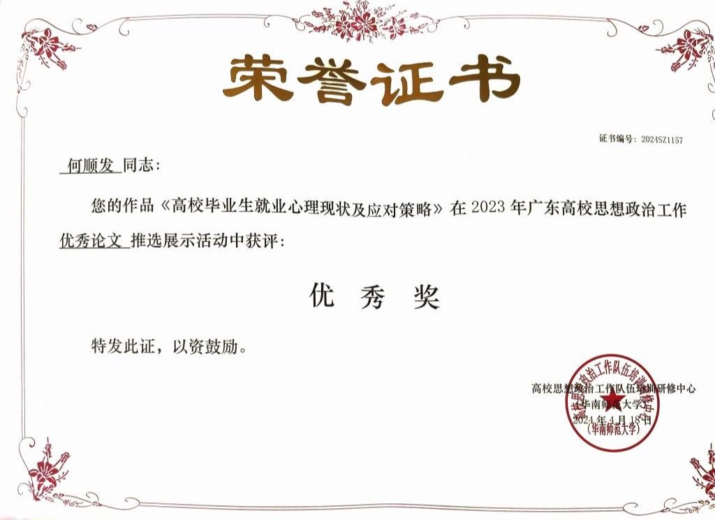 | 10 | 何顺发 | 《高校毕业生就业心理现状及应对策略》 | 优秀奖 |