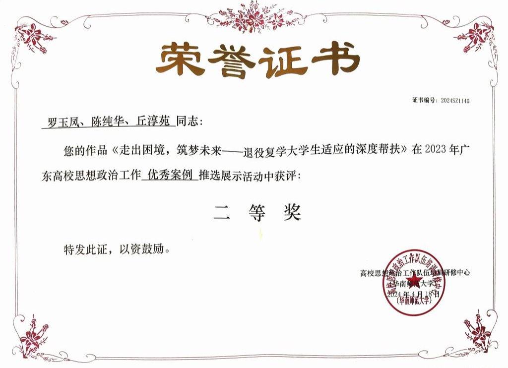 | 罗玉凤、陈纯华、丘淳苑 | 《走出困境,筑梦未来——退役复学大学生适应的深度帮扶》 | 二等奖 |