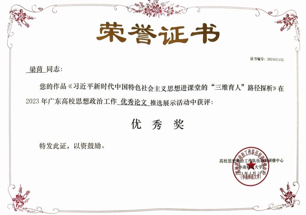 | 梁茼 | 《习近平新时代中国特色社会主义思想进课堂的“三维育人”路径探析》 | 优秀奖 |