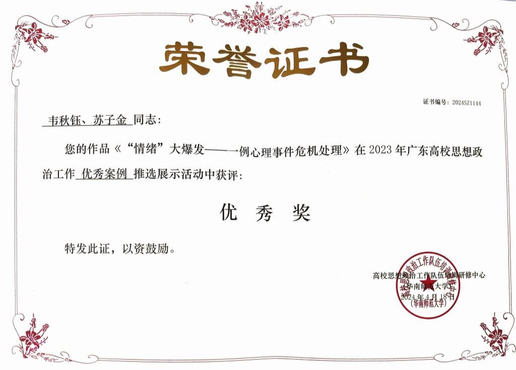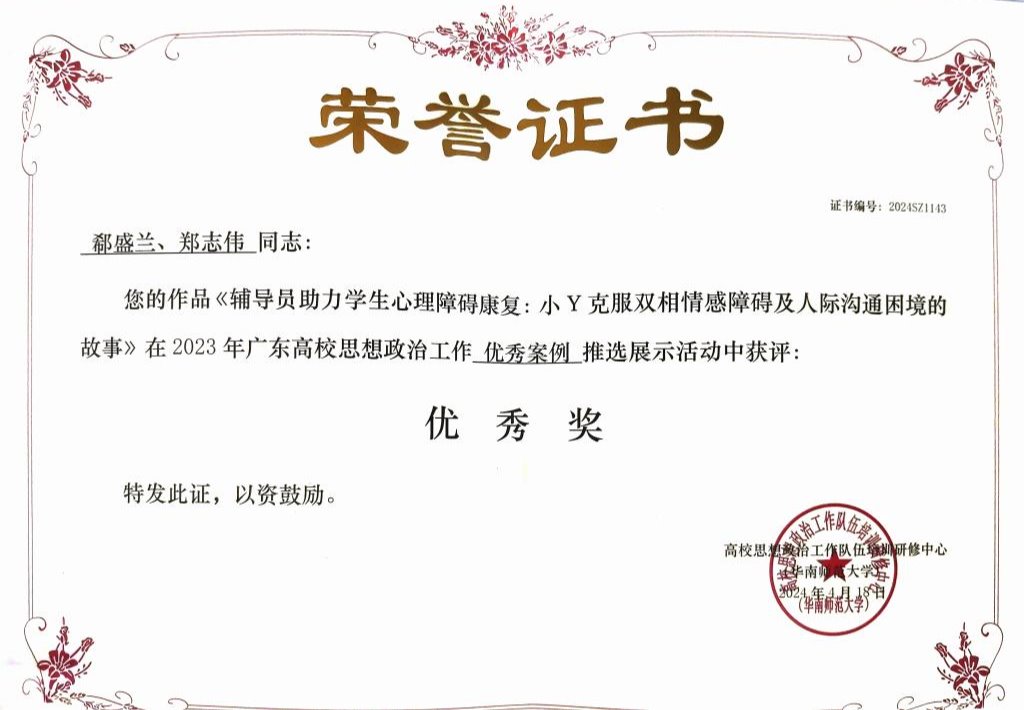 | 郗盛兰、郑志伟 | 《辅导员助力学生心理障碍康复:小Y克服双相情感障碍及人际沟通困境的故事》 | 优秀奖 |