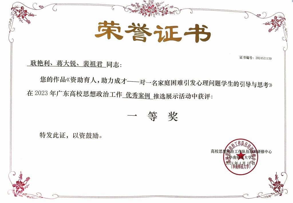 | 耿艳利、蒋大锐、裴祖君 | 《资助育人,助力成才——对一名家庭困难引发心理问题学生的引导与思考》 | 一等奖 |