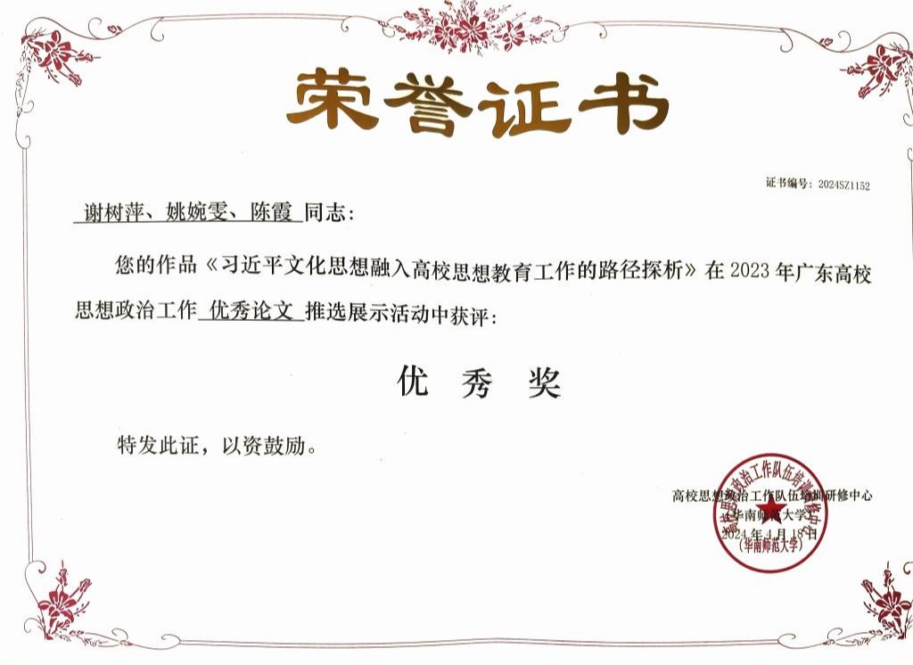 | 谢树萍、姚婉雯、陈霞 | 《习近平文化思想融入高校思想教育工作的路径探析》 | 优秀奖 |