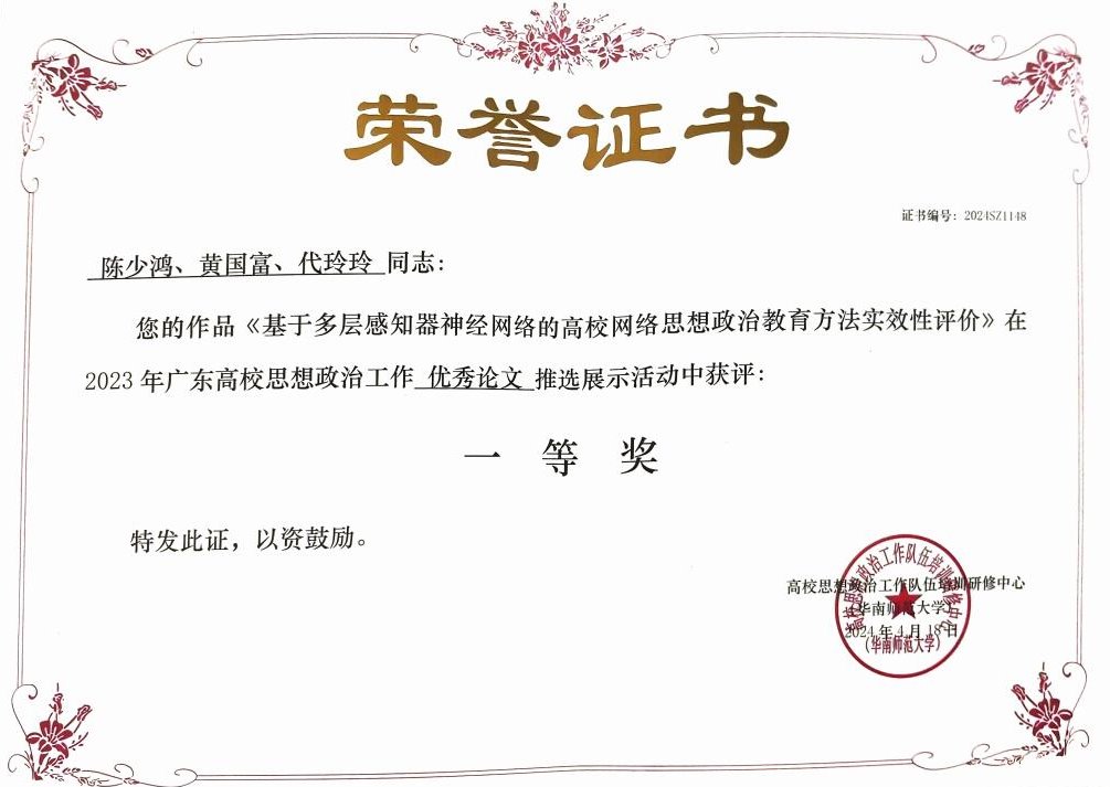 | 陈少鸿、黄国富、代玲玲 | 《基于多层感知器神经网络的高校网络思想政治教育方法实效性评价》 | 一等奖 |