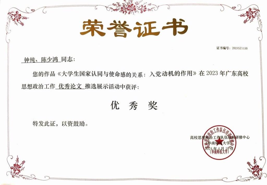 | 钟纯、陈少鸿 | 《大学生国家认同与使命感的关系:入党动机的作用》 | 优秀奖 |