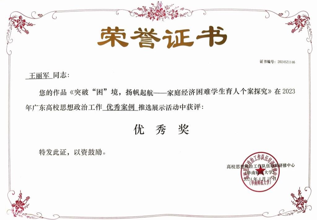 | 王丽军 | 《突破“困”境,扬帆起航——家庭经济困难学生育人个案探究》 | 优秀奖 |