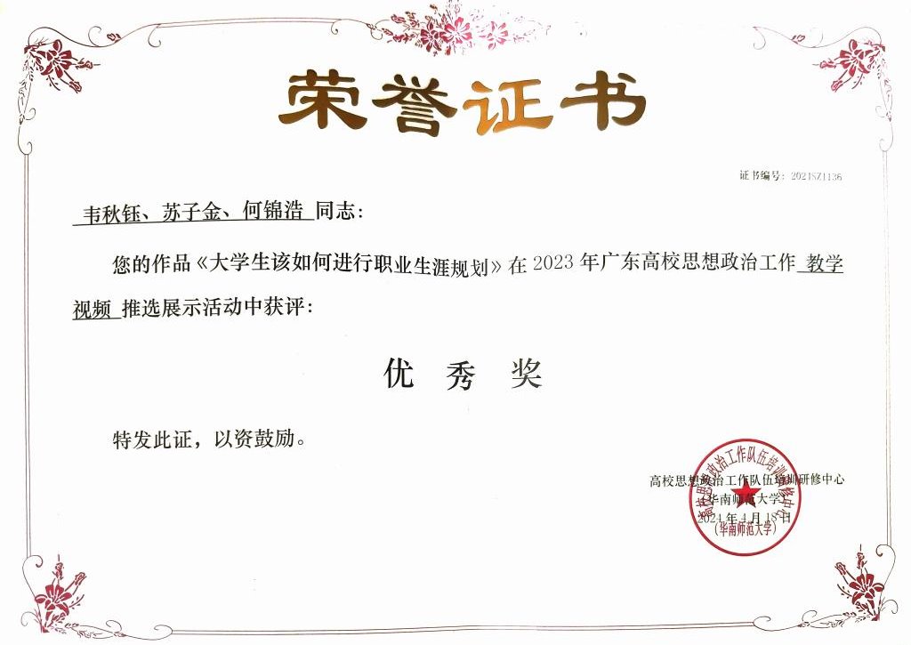 | 韦秋钰、苏子金、何锦浩 | 《大学生该如何进行职业生涯规划》 | 优秀奖 |