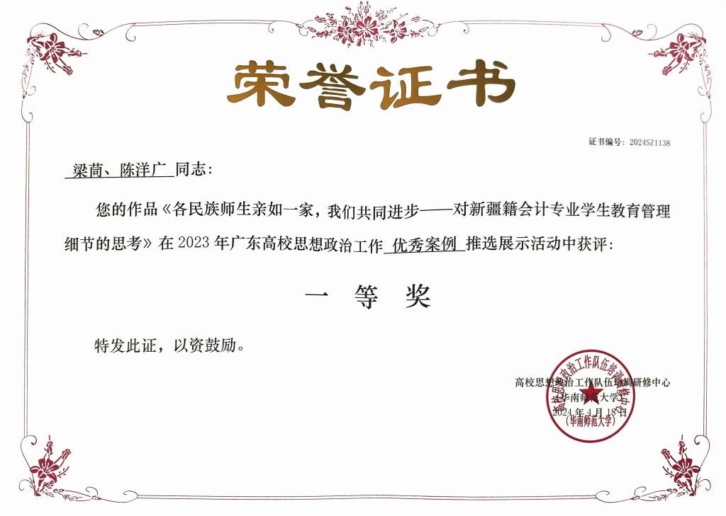 | 梁茼、陈洋广 | 《各民族师生亲如一家,我们共同进步——对新疆籍会计专业学生教育管理细节的思考》 | 一等奖 |