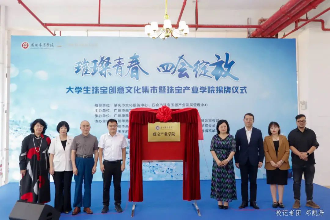 在与会嘉宾与全体师生的见证下,四会市人民政府副市长梁俊杰及学校领导共同揭牌。标志着广州华商学院珠宝产业学院正式成立。