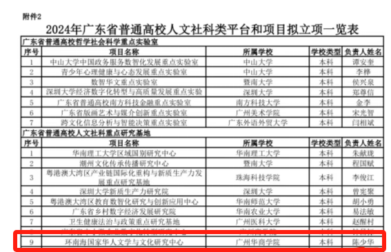 近日,广东省教育厅公布了2024年度普通高校重点科研平台和项目立项名单,广州华商学院“环南海国家华人文学与文化研究中心”(主持人:陈少华教授)获批广东省普通高校人文社科重点研究基地,标志着我校学科建设发展再上新台阶。