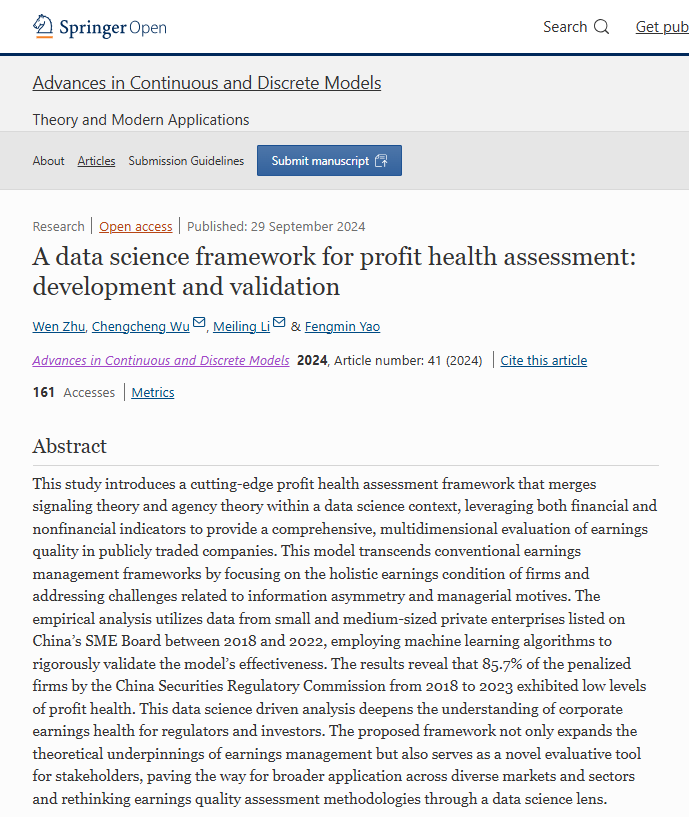 近日,广州华商学院会计学院朱文教授团队论文“A data science framework for profit health assessment: development and validation”在施普林格旗下的国际期刊《Advances in Continuous and Discrete Models》上发表。