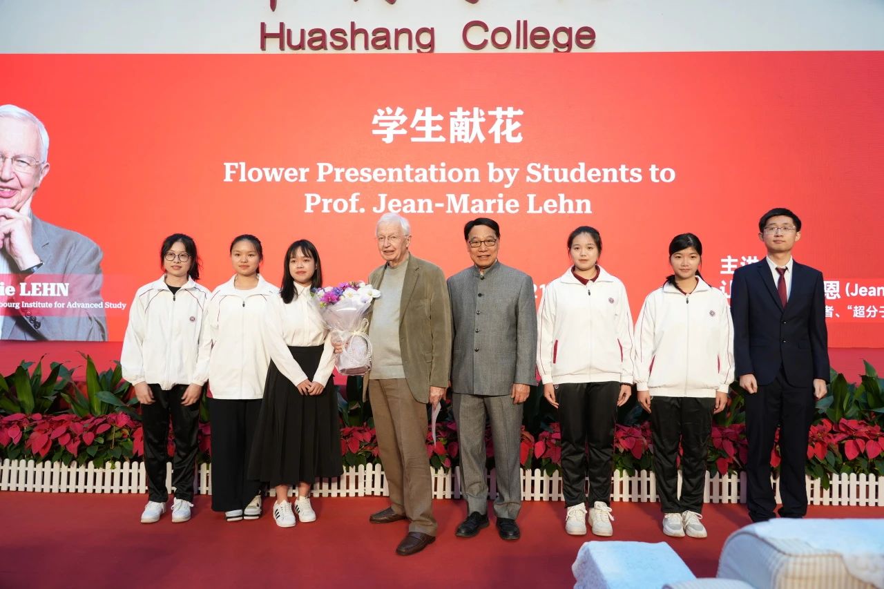 11月21日,诺贝尔化学奖获得者、超分子化学奠基人之一、法国科学院院士、中国科学院外籍院士、美国国家科学院外籍院士、学校荣誉校长Jean-Marie Lehn教授时隔五年再访华商,并为华商师生作《通向复杂物质的阶梯:化学!》专题讲座。广州华商学院校长陈新滋院士、党委书记陈玉欢、副校长吕峻闽,校长助理及各职能部门负责人、各二级学院负责人参加本场讲座。本场讲座采取“线上+线下”的方式,现场600多名师生代表,线上两个平台共吸引2万多名受众共同聆听大咖的精彩讲座。讲座由校长陈新滋院士主持。