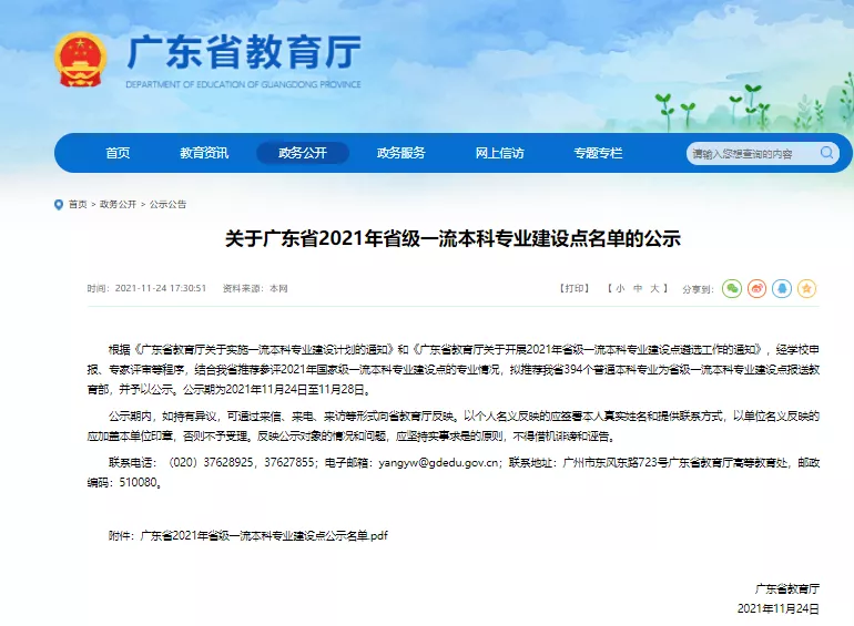 11月24日,广东省教育厅发布了《关于广东省2021年省级一流本科专业建设点名单的公示》。根据《广东省教育厅关于实施一流本科专业建设计划的通知》和《广东省教育厅关于开展2021年省级一流本科专业建设点遴选工作的通知》,经学校申报、专家评审等程序,结合广东省推荐参评2021年国家级一流本科专业建设点的专业情况,广州华商学院广告学专业、信息管理与信息系统专业、审计学专业被推荐为广东省2021年省级一流本科专业建设点。据悉,我院广告学专业是此轮“省一流”中全省唯一的广告学专业点,也是继2019年我院新闻学专业获批“省级一流本科专业建设点”以来,又一突破性成果。