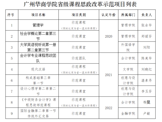 至今为止,广州华商学院共获得9项课程思政示范项目,其中示范团队1项、示范课程3项,示范课堂5项。