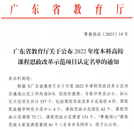 4月11日,广东省教育厅发布了《广东省教育厅关于公布2022年度本科高校课程思政改革示范项目认定名单的通知粤教高函》(粤教高函〔2023〕14号),广州华商学院共有2项课程思政改革示范项目被认定为省级课程思政改革示范项目,其中会计学院的《中级财务会计学》被认定为课程思政示范课程,金融学院的《国际金融第二章第一节传统外汇交易》被认定为课程思政示范课堂。获评为课程思政示范课程的,将同时认定为省级一流本科课程。