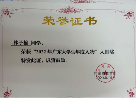 近日,广东省教育厅公布《关于公布2021年、2022年“广东高校辅导员年度人物”与“广东大学生年度人物”名单的通知》(粤教思函[2023]17号)文件。我校耿艳利老师荣获“2021年广东高校辅导员年度人物”入围奖,健康医学院胡万培同学荣获“2021年广东大学生年度人物”入围奖,经济贸易学院林子榆同学荣获“2022年广东大学生年度人物”入围奖。
