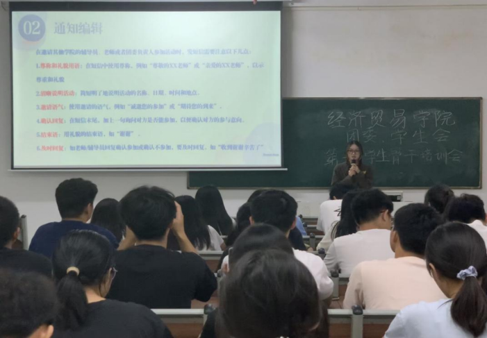 由丘迎春同学为新成员进行骨干培训,她详细地介绍了各部门的负责人和团学组织架构。通过本次介绍各学生骨干对团学结构有了基本了解,同时也对团委、学生会有更全面的认知,这让同学们对自身所属部门有了更清晰的定位。此外,丘迎春同学也向同学们介绍了如何正确编辑消息通知,以及一些细节处理方法,如尊称和礼貌用语、邀请语气等,让新成员们未来在通知、邀请工作中能够更规范地编辑消息通知。