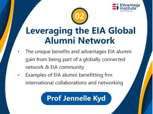 EIA校长Celina Yu博士向大家介绍了EIA的办学情况和EIA董事会成员,并说明了举办此次研讨会的目的。董事会主席Jennelle Kyd教授以“利用EIA全球校友网络”为主题,分享了EIA校友从国际合作和网络中受益的例子,介绍了EIA校友从成为全球互联网络和EIA社区的一部分中获得的独特益处和优势。