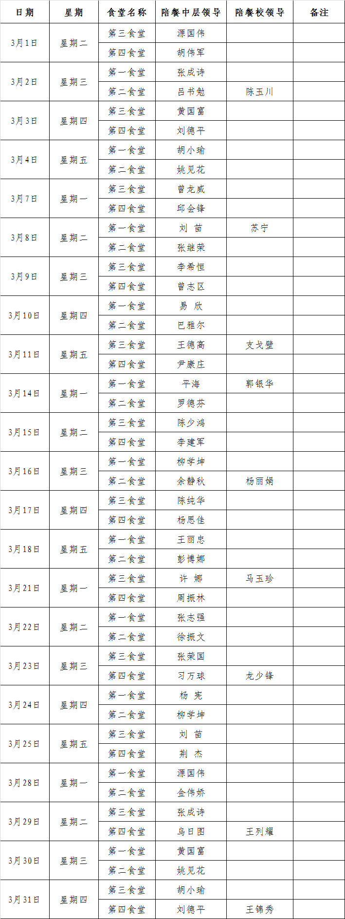 广东财经大学华商学院中层以上领导陪餐安排表(2016年3月份)