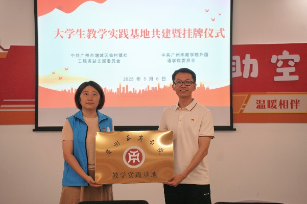 2025年5月6日下午,广州华商学院外国语学院与仙村社工站联合举办挂牌仪式。本次活动旨在通过正式挂牌,推动高校教育资源与社区服务的深度融合,搭建长期合作平台,促进高校师生志愿者与社区青少年教育服务的有效对接,进一步落实“校社共育”理念。广州华商学院外国语学院副院长何顺发一行、增城区仙村社工站李丹站长及相关工作人员出席本次活动。