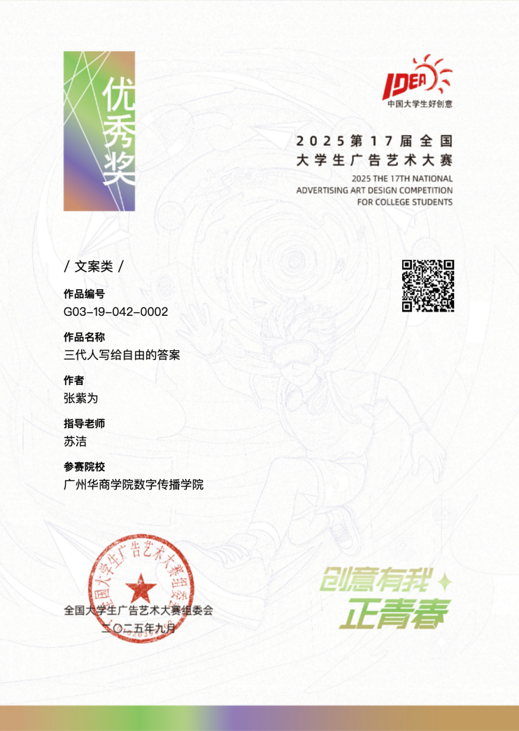 本次获奖作品涵盖视频类微电影广告、策划案类、广播类、文案类等多个类别,充分展示了学院学生跨专业、跨领域的创意思维与实践能力。参赛队伍来自广告学、网络与新媒体、动画学等多个专业,彰显了学院多学科融合、协同育人的优势。