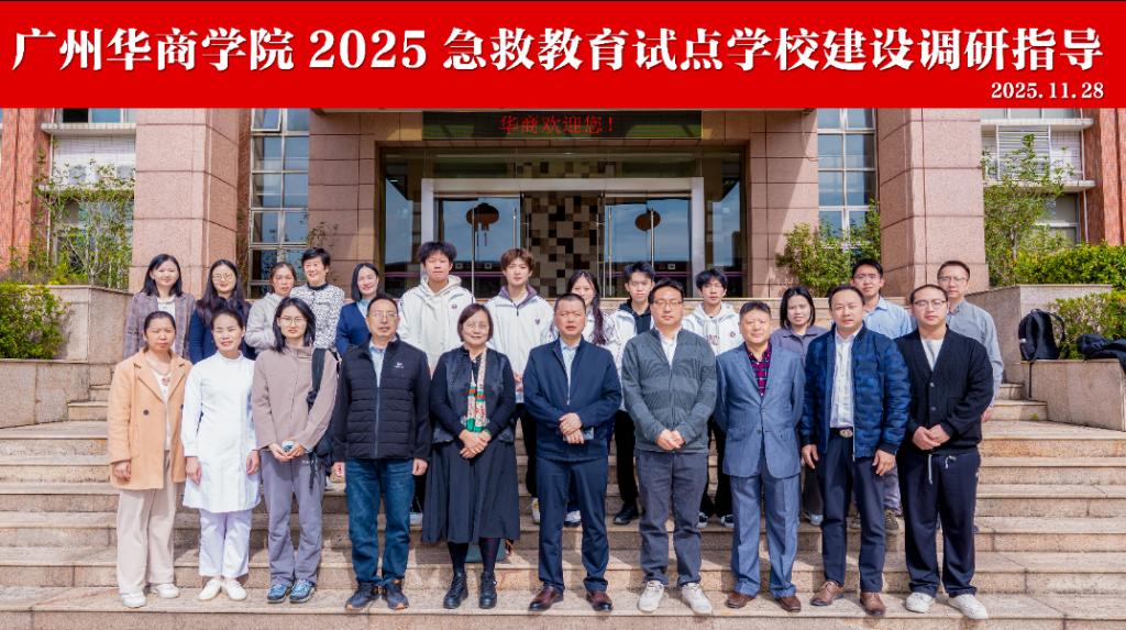 2025年11月28日上午,由省市相关部门专家组成的急救教育试点建设调研指导组(以下简称“指导组”)一行莅临广州华商学院,对我校建设急救教育试点工作进行实地调研与指导。校长助理李远飞、学校办公室主任蒋大锐、健康医学院院长周光雄、副院长翁开源,以及相关部门负责人陪同考察。