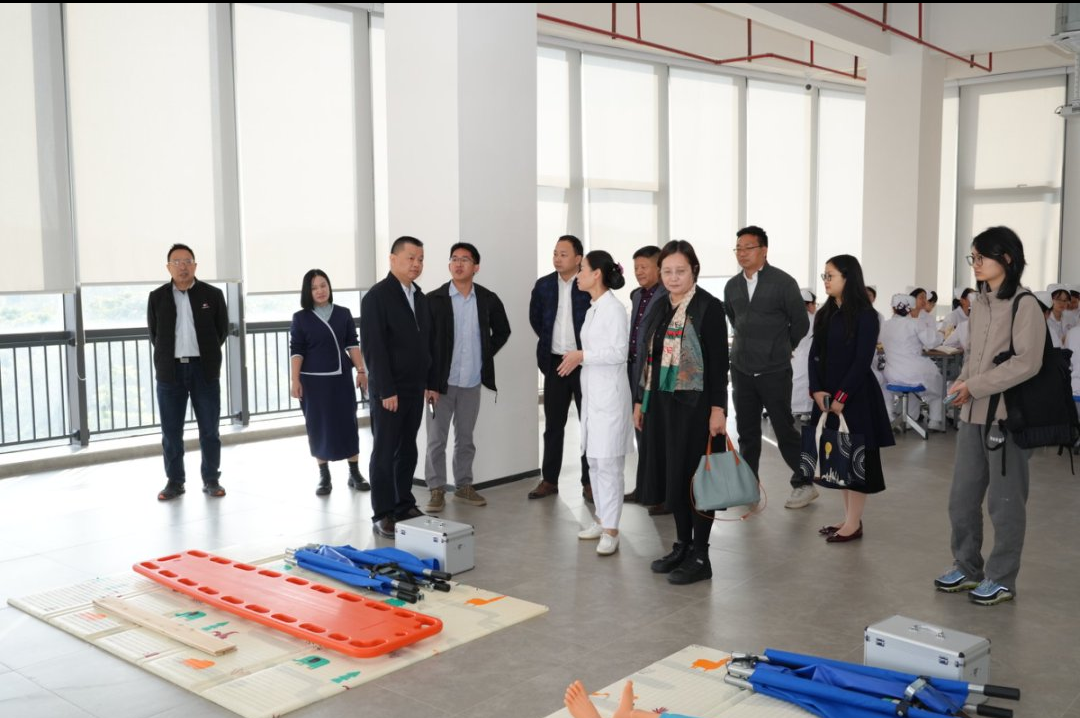 指导组首先走访了健康医学院,走进护理专业课堂、参观模拟病房及急救技能实训中心,对我校办学理念、师资力量以及教学设施给予了高度评价。在参观过程中,健康医学院完善的医学教育体系和专业的实训场地,充分证明了我校具备开展高质量、规模化急救教育所需的坚实基础和核心优势。指导组指出,依托健康医学院专业力量,学校急救教育工作有望实现“高起点、专业化、可持续”的发展目标。