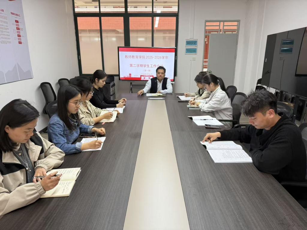 为全面部署新学期学生工作,进一步提升辅导员队伍的专业素养与育人能力,确保各项工作高效有序开展,2月26日下午,教师教育学院学生工作办公室在创新楼206召开2026年春季学期辅导员全体会议。教师教育学院学生工作办公室主任江庆基主持会议,学院全体辅导员参会。