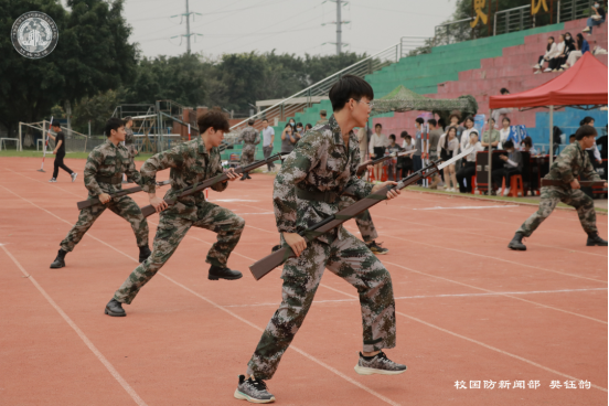 中场休息时,国防教育志愿服务中心作训部的成员为大家带来刺杀操表演,他们铿锵有力的呐喊,整齐划一的动作,彰显了当代大学生的朝气和活力。