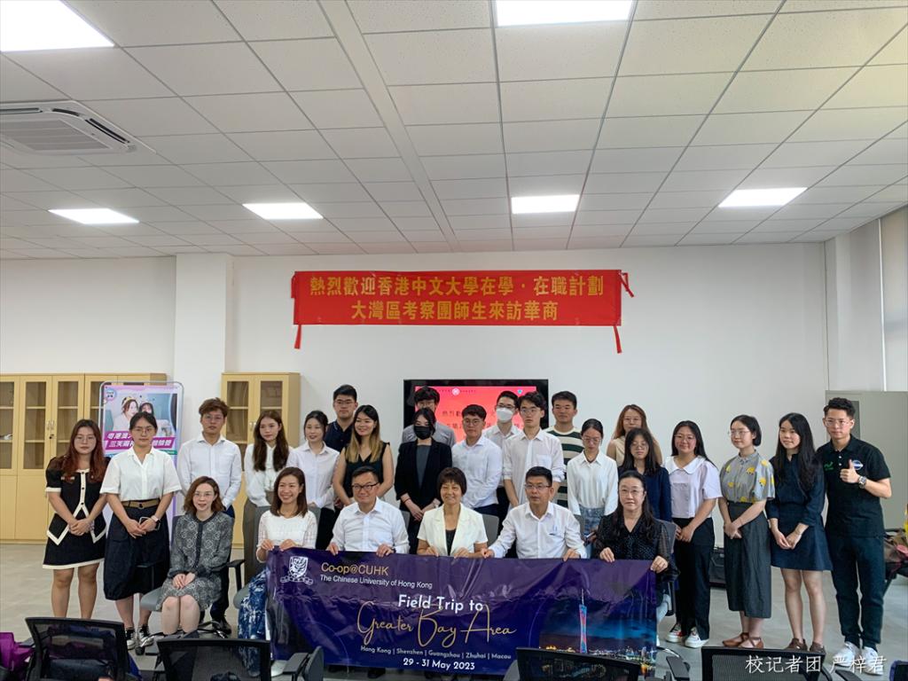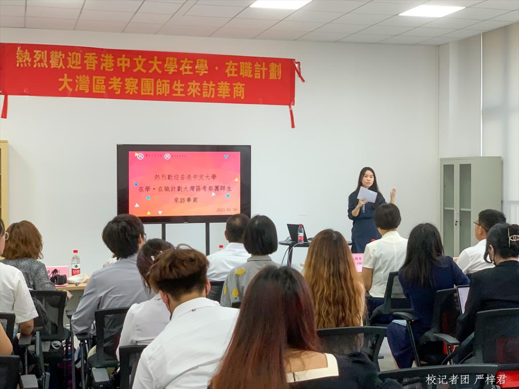 为深入了解粤港澳大湾区教育发展状况,进一步推进教育教学水平提高,实现优秀资源共享,近日,香港中文大学在学·在职计划教育部总监赖汉荣、助理总监傅贝诗、职涯组助理经理黄晓欣,香港中文大学考察团学生等一行代表团参访广州华商学院增城校区,与我校代表在创科楼进行座谈交流。广州华商学院副校长王锦秀、广州华商职业学院副校长余家军、广州华商学院国际学院院长回雁雁以及广州华商学院学生代表参加本次座谈。本次座谈由广东华商教育集团学术专员陈雯姗主持。