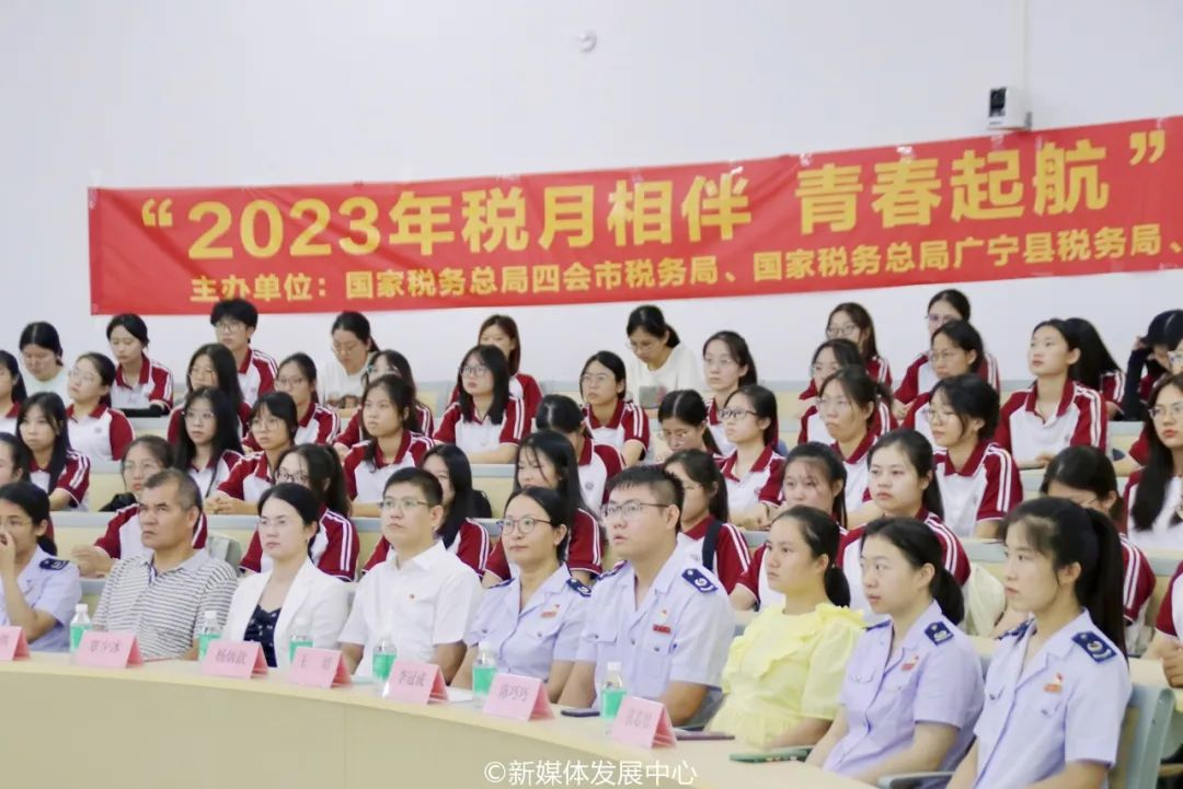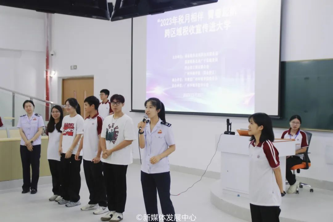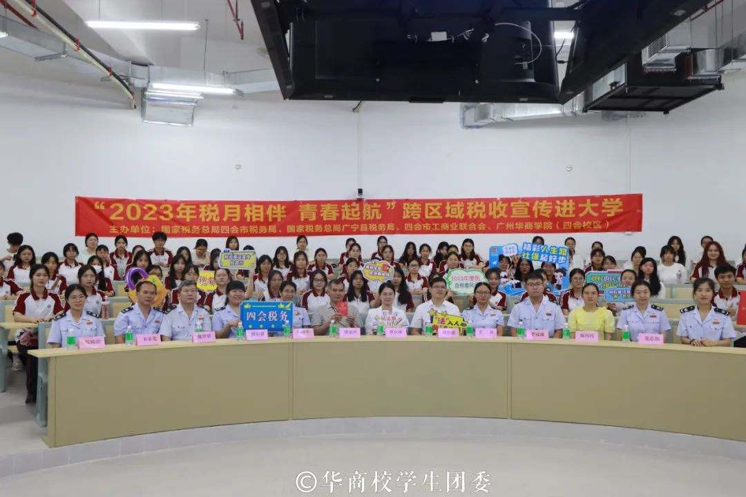 为助力大学生走稳走好创业就业第一步,推进校园税收普法教育和学生税收实践相融合,9月20日,国家税务总局四会市税务局、国家税务总局广宁县税务局、四会市工商业联合会联合我校开展的2023年“税月相伴 青春起航”跨区域税收宣传进大学活动顺利举办。广州华商学院校长助理、四会校区党委副书记、管委会常务副主任覃少冰,四会市税务局党委委员、副局长杨炳歆,四会市工商联会员部部长梁金洪,广宁县税务局第一税务分局局长王培以及税务局、工商联、广州华商学院(四会校区)相关工作人员参加本次活动。