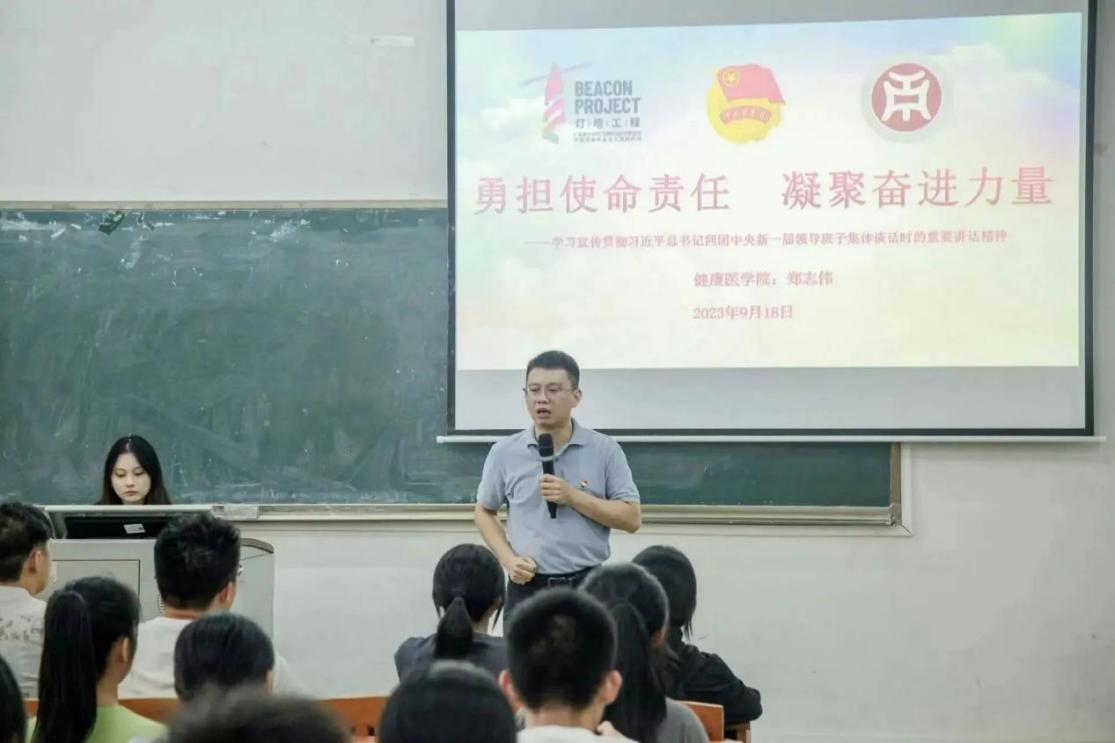 为更好地学习宣传贯彻习近平总书记的重要讲话精神,广州华商学院健康医学院于2023年9月18日下午3:00在励志楼C101开展了主题为“勇担使命责任,凝聚奋进力量”主题团课。健康医学院各学生组织骨干、各班学生代表参与本次会议。郑志伟老师带领同学们细致解读了习近平总书记的重要讲话内容,一览共青团和青年工作的变革历程,深度剖析党中央对共青团工作的新要求,并针对培养什么样的青年、建设什么样的共青团两个问题做出基本概要。郑志伟老师对同学们提出三点嘱托与期望:第一,团结奋进,踔厉向前争做先锋;第二,实干担当,脚踏实地服务为民;第三,钻研学业,精益求精奉献社会。他希望各学生组织骨干、各班学生代表能够将所学习的内容付诸于实践,以实际行动担当青年责任,以刻苦努力建设国家。