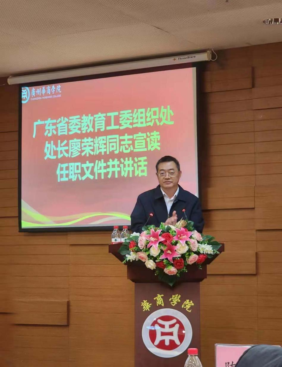 省委教育工委组织处廖荣辉处长宣读任职文件并讲话。廖处长宣布,经中共广东省委教育工作委员会、广东省教育厅研究决定,陈玉欢同志任广州华商学院党委书记兼督导专员。