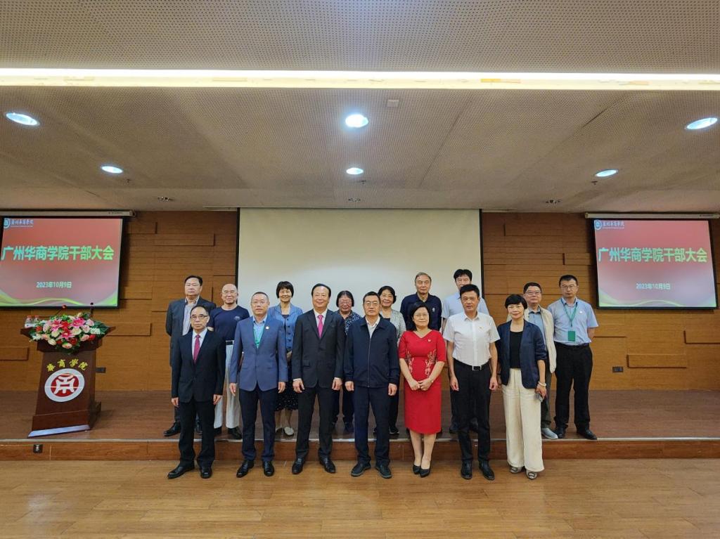 10月9日上午,广州华商学院在中央图书馆学术报告厅召开干部大会。省委教育工委组织处廖荣辉处长、省委教育工委组织处一级主任科员秦玲同志、广东邮电职业技术学院刘春早书记、广州华商学院廖榕就董事长出席会议,全体校领导、学校全体中层以上干部、各二级学院、教学部教师代表参会。会议由广州华商学院执行校长郭银华主持。