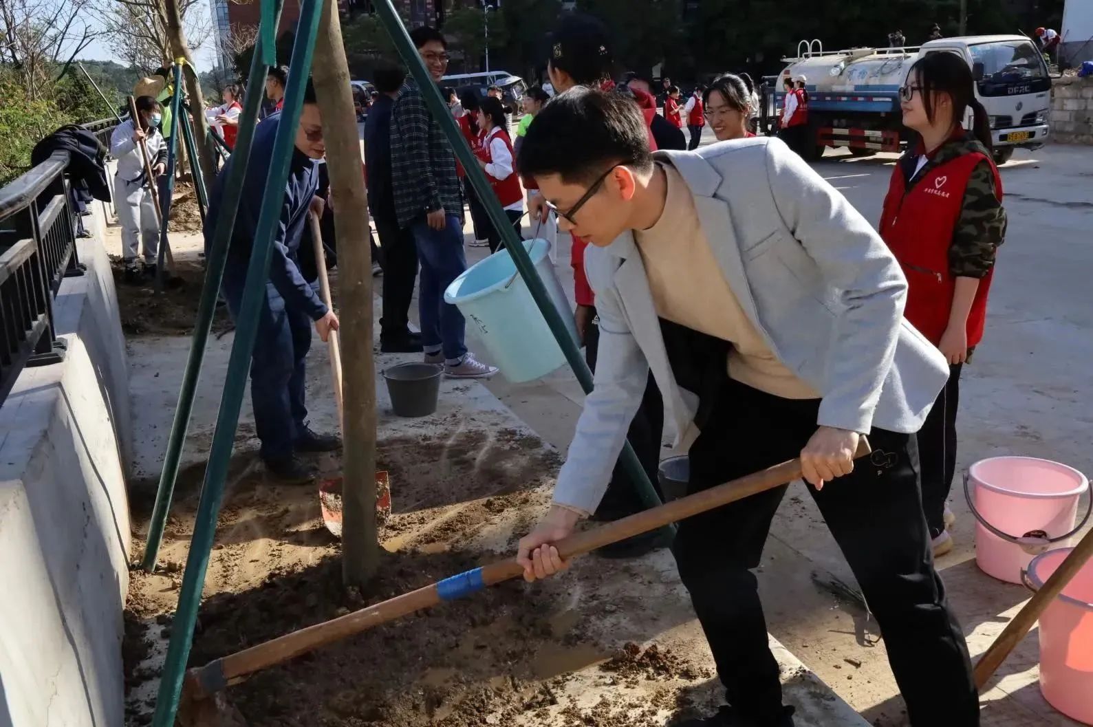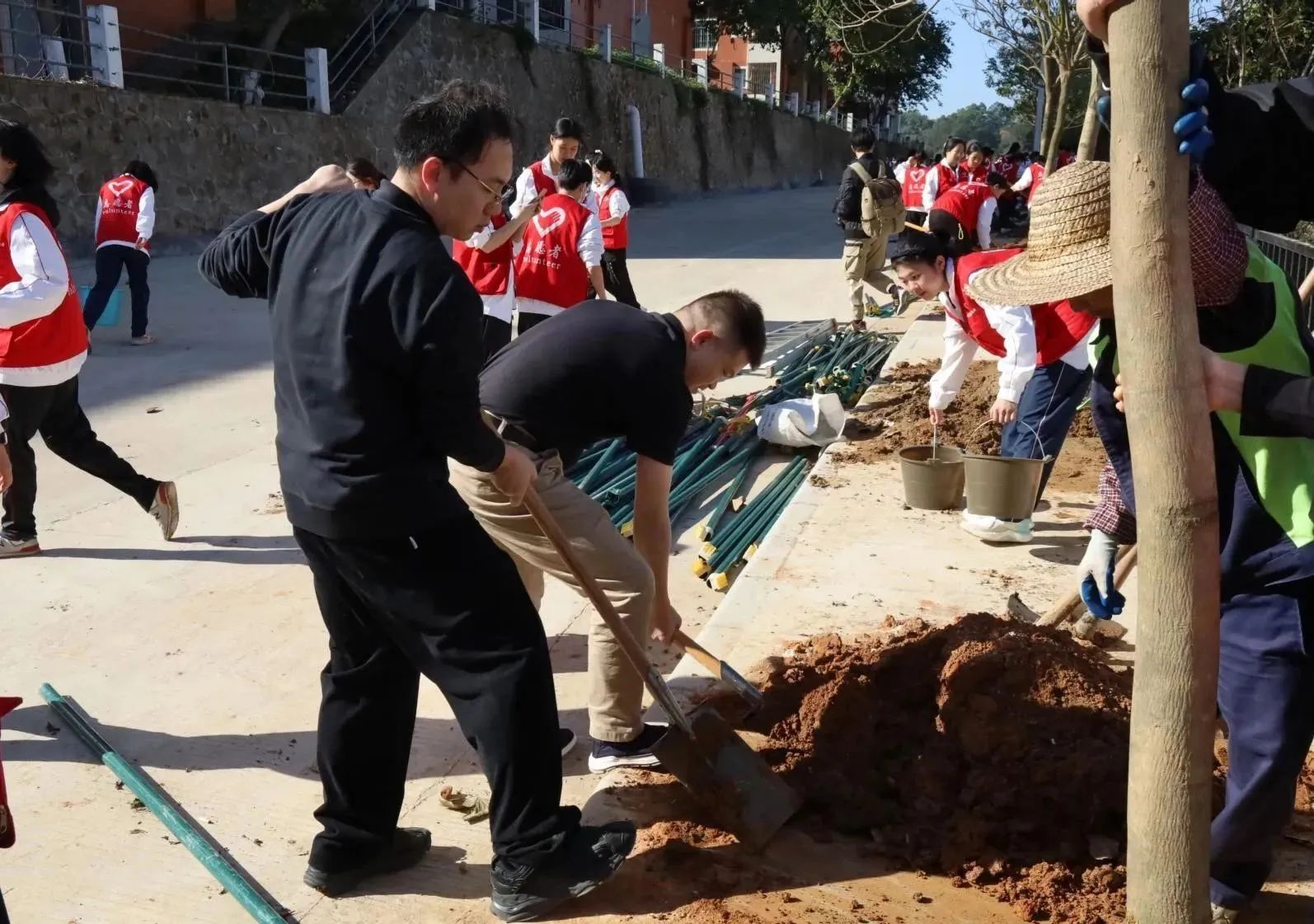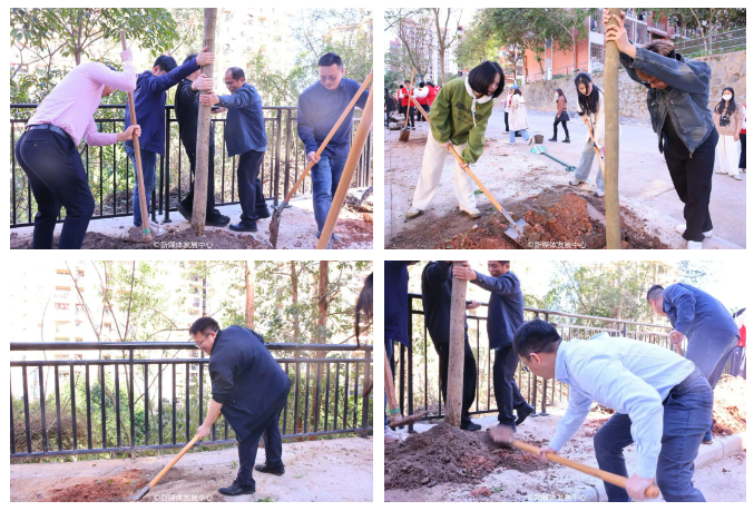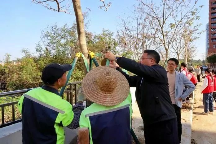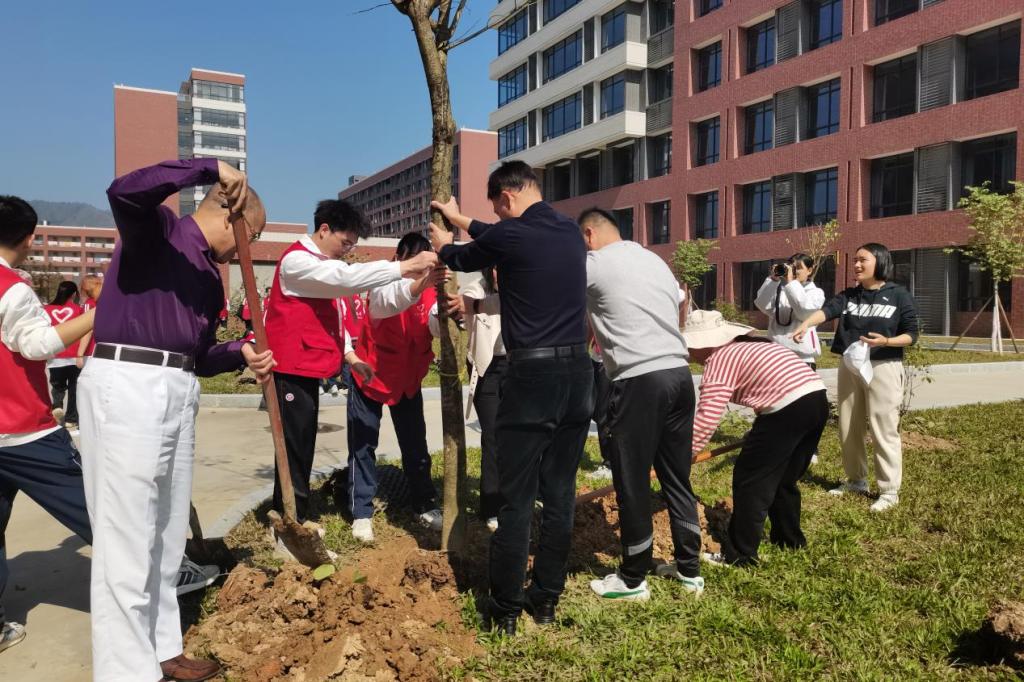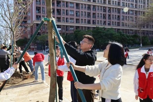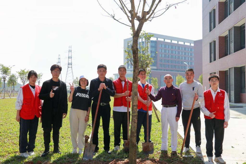 启动仪式后,各院校分别开展植树节活动。为引领华商青年在实践中践行绿色发展理念,助力绿美广东生态建设,广州华商学院“绿美广东 青年先行”植树护绿活动在双校区同步进行。学校党委书记陈玉欢、副校长王卫平、校长助理黄伟新、肇庆校区党委书记苏宁、学校党委委员、各二级学院党团组织负责人、学工主任、学生会指导老师与志愿者、绿化工人一道,为华商校园再添新绿。