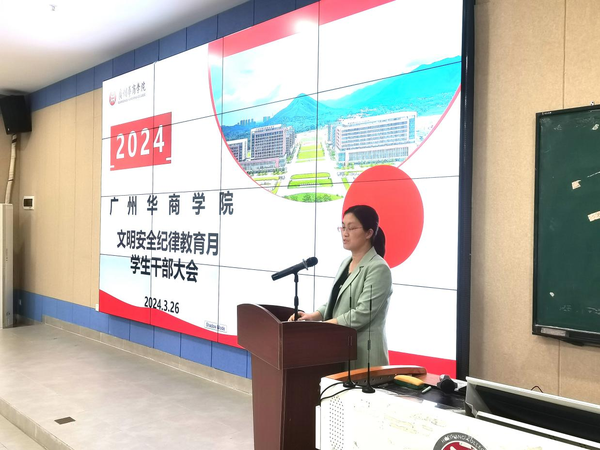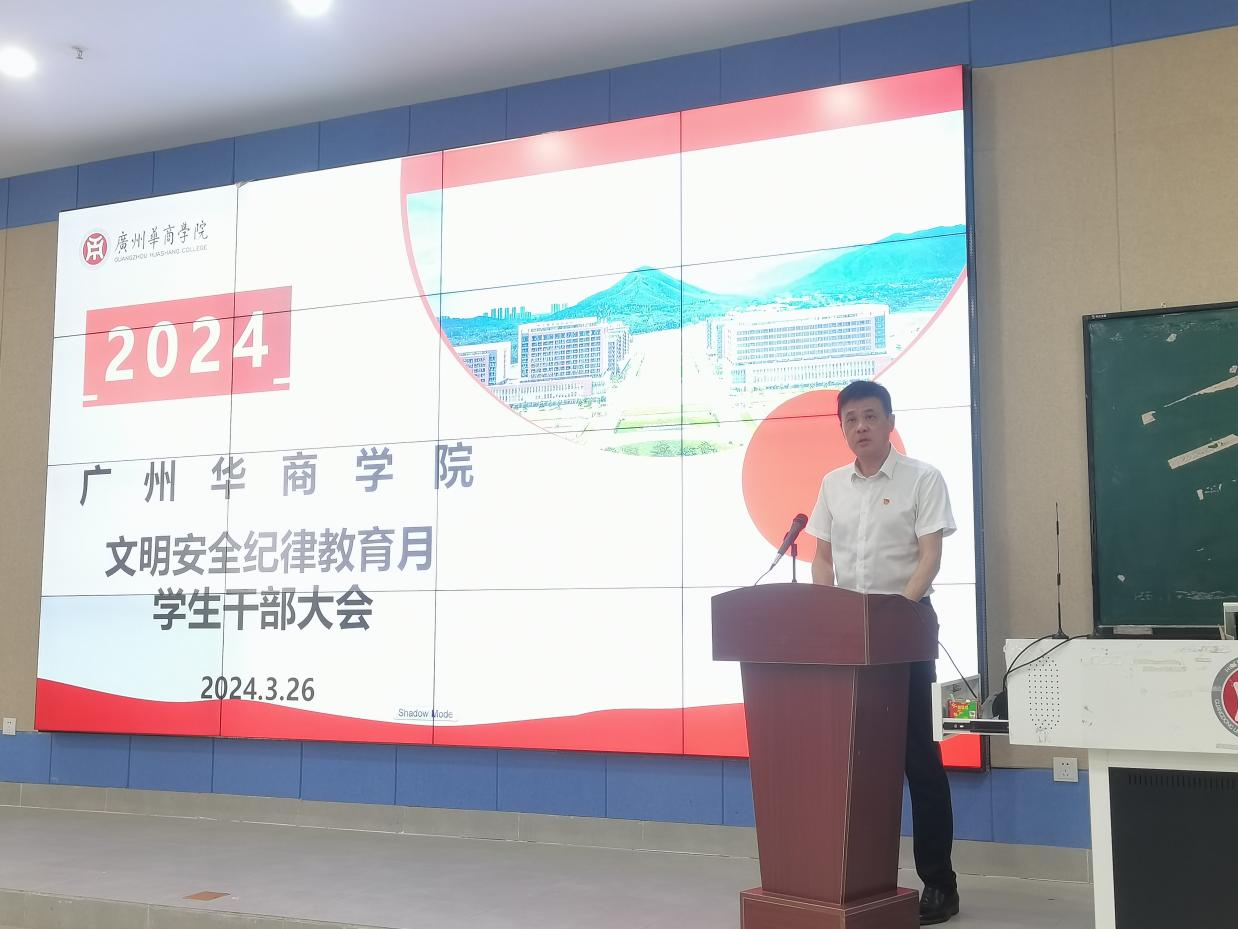 2024年3月26日下午14:30,广州华商学院肇庆校区在8号楼108室召开文明安全纪律教育月学生干部大会。出席本次会议的有:广州华商学院副校长王卫平教授,肇庆校区党委书记苏宁,校长助理、肇庆校区管委会常务副主任覃少冰同志,管委会副主任、学生工作办公室主任付蔚莹同志,后勤保卫办公室副主任徐强同志,学生工作办公室思教科副科长古文胜同志以及各学院学工负责人及学生干部代表,此次会议由古文胜老师主持。