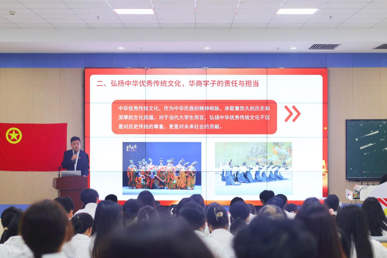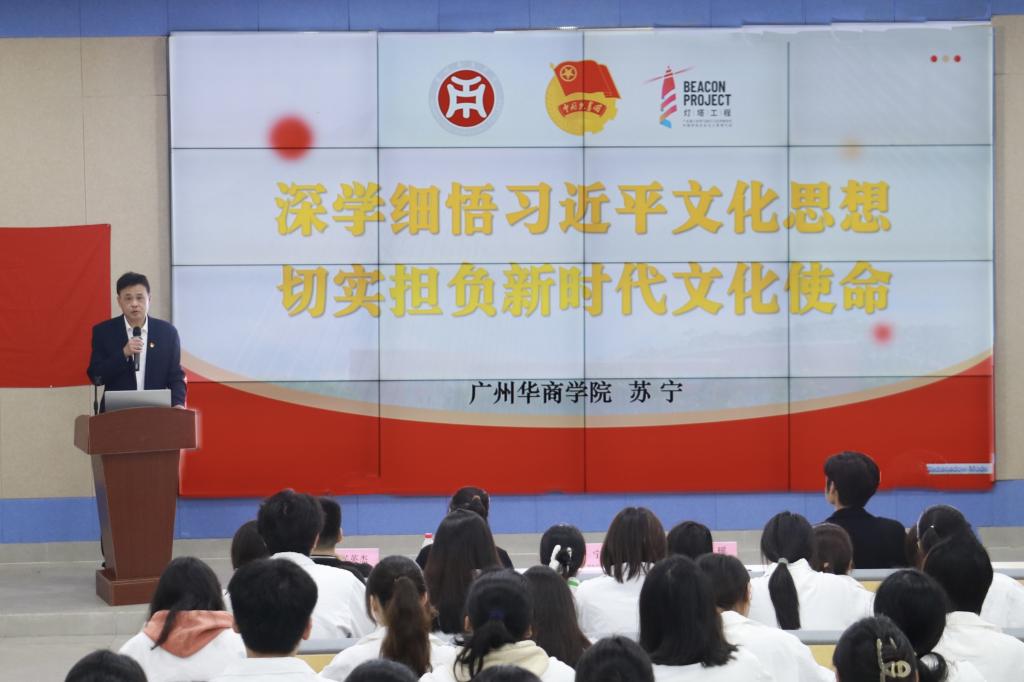 苏宁书记的授课深入浅出,既有理论的高度,又有实践的深度,为同学们更好地在践行文化自信,服务“国之大者”和“省之大计”、推进学校高质量发展中找准自己的青春定位提供了重要指引。他以习近平总书记对宣传思想文化工作作出的重要指示为切入点,围绕宣传思想文化工作的重要意义、任务等方面,为华商学子深刻解读了党的创新理论。