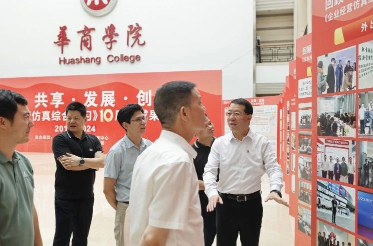 华商教育集团董事长廖榕就,学校总督学,党委书记陈玉欢,副校长刘少波、吕峻闽,学校顾问郭银华,广东财经大学国家级实验教学中心主任姚维保,副主任李立君,教学部部长陈韦伶,广东白云学院经管中心主任贺雪荣,广州华商学院会计学院、管理学院、人工智能学院等院系领导及师生,共同参观了《企业经营仿真综合实习》课程10周年成果展,见证了课程发展建设的阶段性“成绩单”。