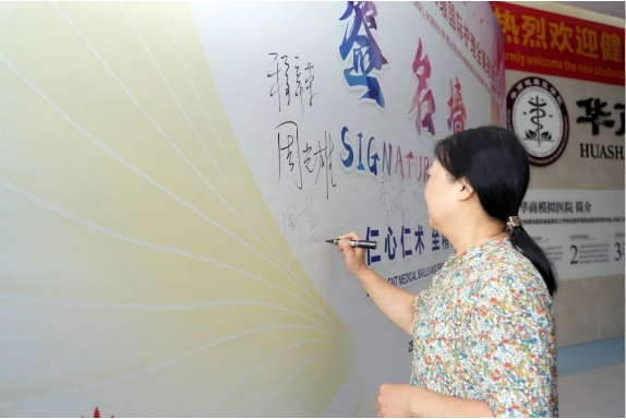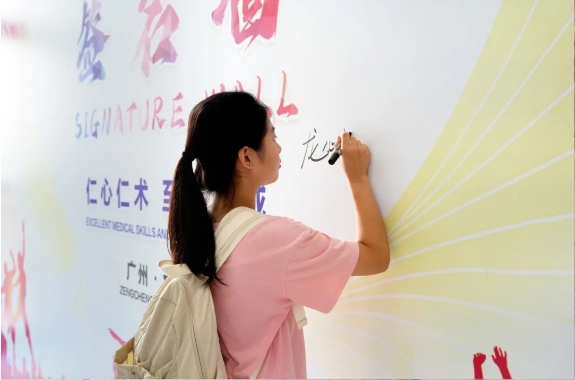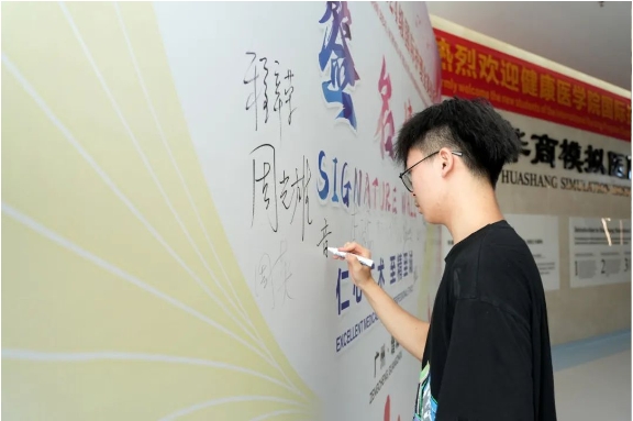 迎新现场,鲜红的标语、新生签名墙等布设见证着同学们朝气蓬勃、投身健康医疗事业的新开始。