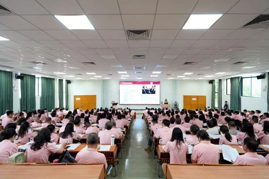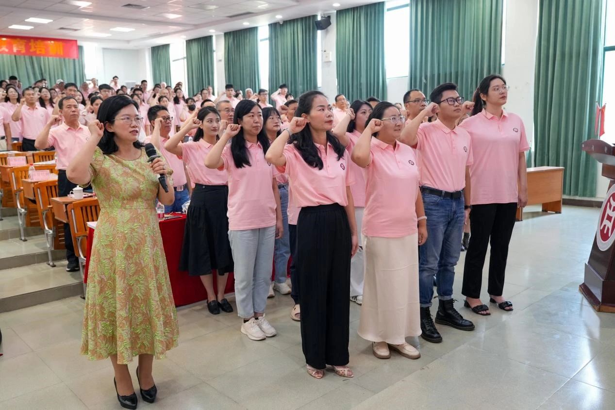 广州华商学院2024年新教师入职教育第一场集中培训在庄严的国歌声中拉开序幕。党委书记陈玉欢代表学校对新教师表示热烈的欢迎和衷心的祝福。她表示,新入职教师是华商的新鲜血液,是学校朝气蓬勃精神面貌的体现,希望新教师能尽快转变角色、快速成长。会上,全体新教师在党委书记陈玉欢的带领下,进行庄严的入职宣誓仪式。坚定有力的誓词回荡在报告厅内,新教职工必将秉承“厚德、励志、博学、创新”的校训,做学生良师益友,铸教师高尚人格,为全体学生美好未来、华商学院教育发展而不懈努力。