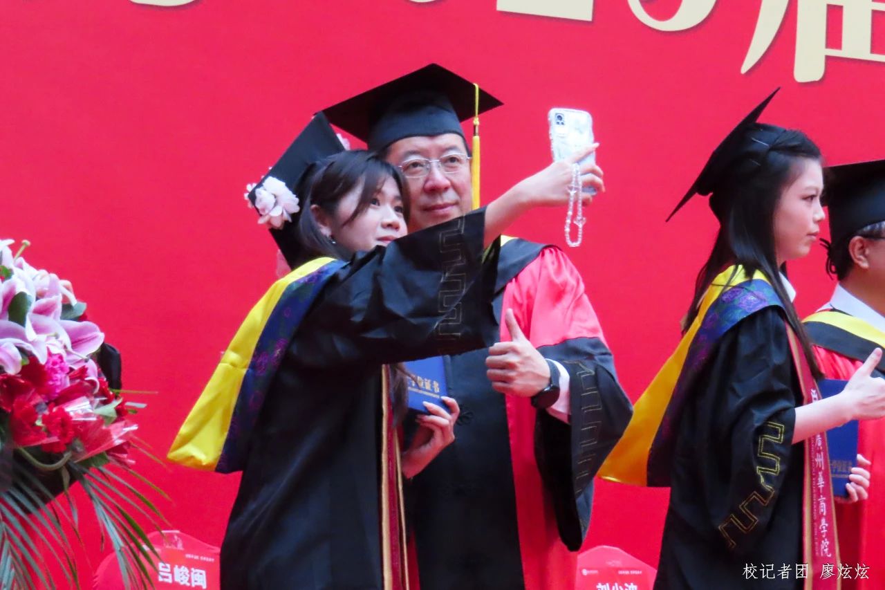 毕业生代表会计学院赖有俊分享了自己在华商四年的学习与收获。从蝉联综测魁首、勇夺省级审计竞赛特等奖,到以优异成绩考取广东财经大学研究生,他坦言,每一次淬炼都是华商沃土赋予的成长底气,并鼓励华商学子成为一名积极、自律、勤奋的人。作为中共党员,赖有俊表示,将牢记校领导和老师的谆谆教诲和殷切嘱托,将个人理想融入家国梦想,让“小我”在“大我”中找到价值坐标。