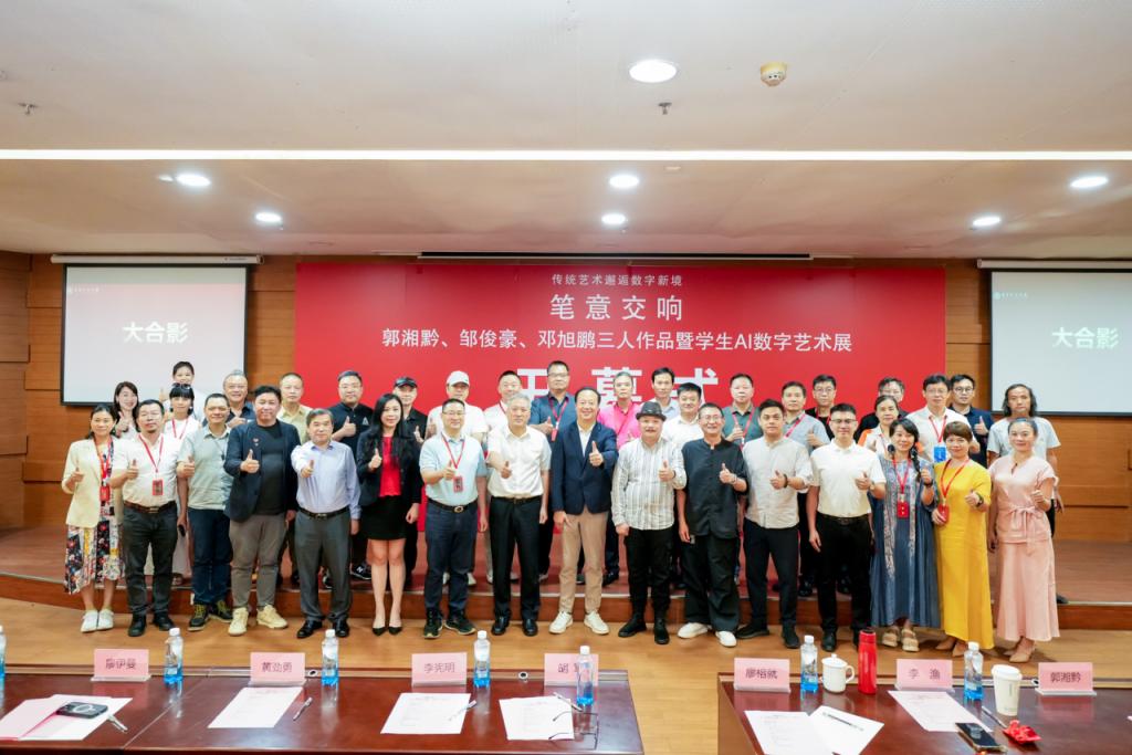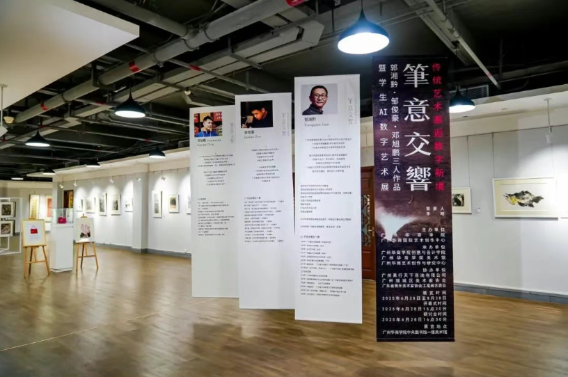 6月28日,由广州华商学院、广州华商国际艺术创作中心主办,广州华商学院创意与设计学院承办,广州果行天下咨询有限公司、广州增城区美术家协会、广东省青年美术家协会工笔画艺委会协办,广州华商学院创意与设计学院李明老师策展的“笔意交响–郭湘黔、邹俊豪、邓旭鹏三人作品暨学生AI数字艺术展”在广州华商学院中央美术馆举行。