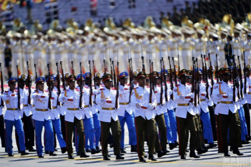 军乐团、合唱团奏唱歌曲。这个是中国阅兵史上的第一次,世界上目前也无其他国家同时组织这么多男性军人在阅兵时一起合唱。