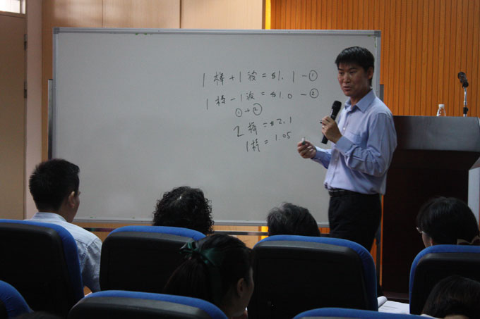 陈博士的授课题目为“投资心理学”,授课过程中,陈博士分别用粤语和英语进行讲解,用案例教学、图形对比、演绎归纳、图表数据等教学手段阐述了投资心理学的八个主要内容。包括定义范畴、理性假设、展望理论、心理账户、风险规避、失误判断、对冲基金和投资成功要素(智力与控制)。在场的教师在轻松愉快的互动中聆听了港大陈博士的精彩演绎。